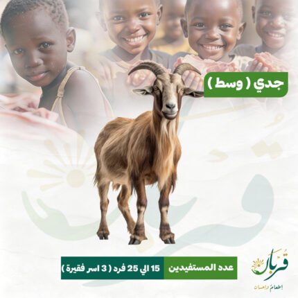 جدي ماعز متوسط الحجم يتم ذبحه بشكل قانوني بالكامل، ويتم توزيع لحومه على الفقراء والمحتاجين وفق ضوابط دقيقة تضمن وصوله إلى من يستحقه. ونضمن اختيار الأغنام لتكون مناسبة من حيث الصحة والحجم، وأن يتم الذبح وفق الشريعة الإسلامية المعتمدة، ومن ثم تحضير اللحوم وتوزيعها لتحقيق أكبر فائدة ممكنة للأسر المحتاجة.