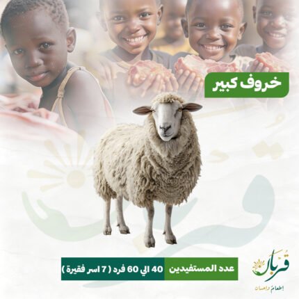 - الوصف: خروف كبير الحجم يتم ذبحه بشكل قانوني بالكامل، ويتم توزيع لحومه على الفقراء والمحتاجين وفق ضوابط دقيقة تضمن وصوله إلى من يستحقه. ونضمن اختيار الأغنام لتكون مناسبة من حيث الصحة والحجم، وأن يتم الذبح وفق الشريعة الإسلامية المعتمدة، ومن ثم تحضير اللحوم وتوزيعها لتحقيق أكبر فائدة ممكنة للأسر المحتاجة.