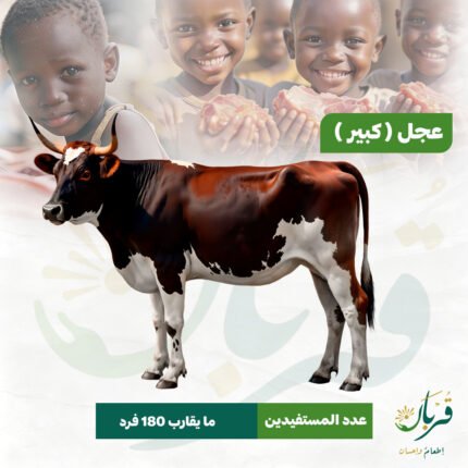 عجل كبير الحجم يتم ذبحه بشكل قانوني بالكامل، ويتم توزيع لحومه على الفقراء والمحتاجين وفق ضوابط دقيقة تضمن وصوله إلى من يستحقه. ونضمن اختيار الذبائح لتكون مناسبة من حيث الصحة والحجم، وأن يتم الذبح وفق الشريعة الإسلامية المعتمدة، ومن ثم تحضير اللحوم وتوزيعها لتحقيق أكبر فائدة ممكنة للأسر المحتاجة.